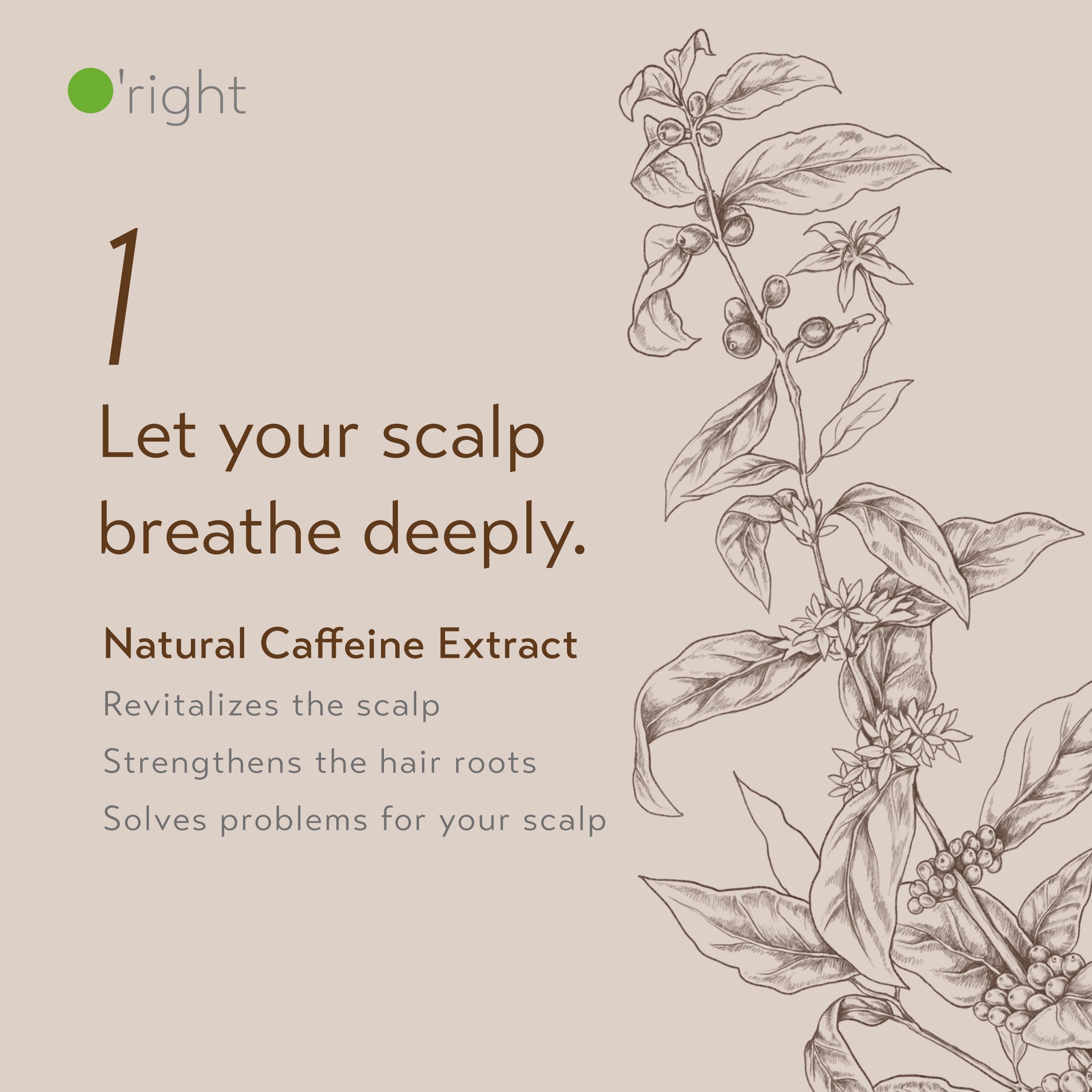 Koffein aktiviert die Mikrozirkulation der Kopfhaut, fördert die Nährstoffversorgung der Haarwurzeln und kann so das Haarwachstum anregen. Die O’right Caffeine Serie nutzt natürlichen Koffeinextrakt aus recycelten Kaffeebohnen – nachhaltig, hochwirksam und dermatologisch gut verträglich.